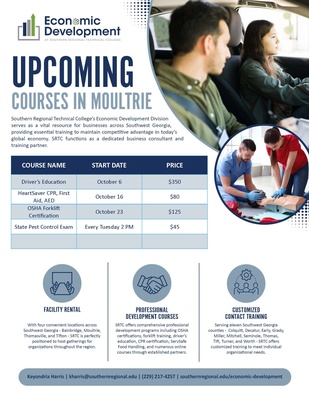 Southern Regional Technical College’s Economic Development Division is offering a series of professional development courses this October to support workforce training and career growth across Southwest Georgia. These programs provide valuable skills, certifications, and hands-on training designed to meet industry standards and community needs.